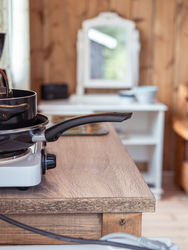 "Veslestugu" Trivelig hytte i romantisk landstil. Hytta har dobbeltseng for to personer, samt en hjørnesofa som inntil to personer kan sove på. Hytta inneholder også en liten kjøkkenkrok med litt utstyr, kjøleskap og kokeplate. Stua har en koselig sofakrok med bord. Egen uteplass og parkering ved hytta. Mat og drikke kan kjøpes om ønskelig.